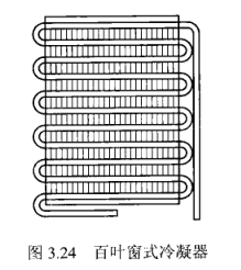1)頁窗式冷凝器。百頁窗式冷凝器的結構如圖3.24所示。它是將銅管或邦迪管(一種內表面及外表面都鍍銅的焊接鋼管)制成盤管,并壓入沖有百葉窗的濟鋼板的管槽內增大散熱面積。意大利等歐洲國家生產的電冰箱多采用這種結構的冷凝器。