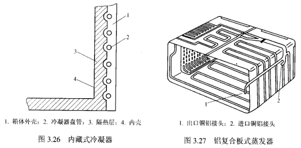 3)內藏式冷凝器。內藏式冷凝器是把鋼管或制成盤管,用鋁箔膠粘帶把盤管粘于冰箱外殼的內側表面上,利用冰箱外殼板散熱,其結構如圖3.26所示。冷凝管的位置可在冰箱外殼背部或左右兩側的內表面。內藏式冷凝器具有平整、便于清潔、外形美觀等優點。但這種冷凝器的散熱效果比外露式的低,故要在冰箱的底部設一個附加冷凝器來改善散熱條件。此外,這種冷凝器如內部管路發生泄漏就很難檢修。內藏式冷凝器多用于日本及我國生產的冰箱內。