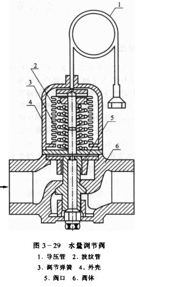 水量調節閥的結構如圖329所示。閥頂端的毛細管與制冷壓縮機排氣上的旁通孔連接。當冷凝器的熱負荷增大時.冷凝壓力上升,閥內波紋管被壓縮,通過頂桿向下推動閥門,使閥口開大,冷卻水流量增大,從而使冷凝壓力降低;當冷凝器熱負荷降低時,冷凝壓力下降,波紋管伸長。彈簧推動頂桿向上移動.使閥孔關小.冷卻水流量減少,冷凝壓力上.;當制冷壓縮機停止工作時。冷凝壓力大幅度下降.閥門逐漸關小以至完全關閉。這種水量調節閥的啟動壓力一般在0.6 MPao調節閥體上的調節螺,可改變閥的開啟度。