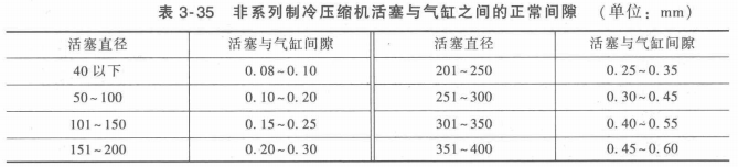 活塞、氣缸的間隙與制造金屬材料、選擇潤滑油的性能以及機器轉速等因素有密切關系,設計時一般有規定數值。對于非系列制冷壓縮機,通常選用相當于活塞直徑千分之一的數值,其正常間隙見表3-35。
