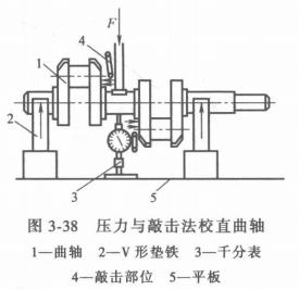 曲軸發生彎曲 對彎曲不大的小型曲軸可采用靜點機械壓力以敲擊校正,如圖3-38所示。在中間一道曲軸頸或曲拐曲軸頸部加壓部位的下面立好千分表,然后分段緩慢地增加其壓力,最后一次下壓量不能過大,避免曲軸非彈性變形。另外,曲軸校直時的反向壓彎量要比原來彎曲量大些,以不超過原來彎曲量的1~1.5倍為宜,這樣校直后的曲軸具有徽量的反向彎曲。沿曲軸長度方向進行“冷作”,以便分散塑性變形,可以增加曲軸的耐疲勞強度。
