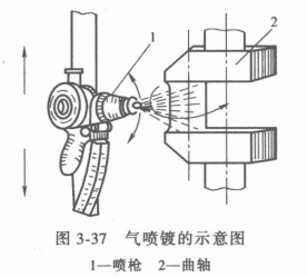另一種方法是金屬氣噴鍍,其作用和電噴鍍相類似,所不同的是氣噴鍍只有一根碳鋼絲,而熔化鋼絲是用氧乙炔火焰。氣噴的主要設(shè)備是噴槍,并在噴槍頭部裝置一個(gè)空氣帽,噴槍作上下運(yùn)動(dòng),曲軸作旋轉(zhuǎn)運(yùn)動(dòng),如圖3-37所示。