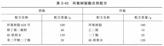先用堿水清除油垢,后用汽油脫脂干凈,然后將裂紋處鏨成V形槽,露出金屬表面。粘合修理時,先用丙酮將機體裂縫仔細清洗干凈,然后加熱環(huán)氧樹脂,使其軟化,逐漸變成黏稠狀的液體。當(dāng)溫度達到85℃時,用木棍攪拌3~5min,將環(huán)氧樹脂內(nèi)的水分、氣泡排出去,然后停止加熱片刻,將增塑劑按一定的配比放入,使其溫度保持在80~90℃之間,再均勻攪拌5~7min,以消除混合劑中的氣泡。環(huán)氧樹脂黏合劑的配方見表3~43。
