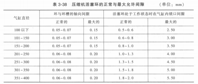 4.將氣缸和油環(huán)裝入活塞環(huán)槽內(nèi)。裝配時(shí),要檢查活塞的表面狀態(tài),環(huán)摺口邊緣凡有毛刺應(yīng)仔細(xì)刮除掉。活塞環(huán)應(yīng)能方便地卡進(jìn)環(huán)槽中,并在槽中靈活自如地轉(zhuǎn)動(dòng)。如果發(fā)現(xiàn)卡咬現(xiàn)象,應(yīng)對(duì)環(huán)槽進(jìn)行修刮。活塞環(huán)兩端平面與環(huán)槽之間的間隙應(yīng)在0. 05~0.08mm之間,活塞環(huán)搭口間隙取決于缸徑,一般缸徑大,間隙可略大;反之則小。具體見表3~38。