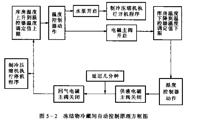 當(dāng)冷間溫度升至溫度控制器的設(shè)定值上限時,溫度控制器動作,指令電磁閥1,3開啟,向蒸發(fā)器2供液,冷間開始降溫;當(dāng)冷間溫度降至下限時,溫度控制器又指令電磁閥1關(guān)閉,延時數(shù)分鐘后.再關(guān)閉電磁主閥3。其控制原理方框圖如圖5一2所示。