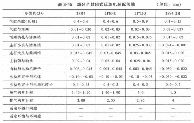 當需要作剖殼修理時,先將全封閉式制冷壓縮機充氟利昂管鋸開,放出制冷劑。然后再將殼剖開,拆卸氣閥組、連桿活塞、電動機等。如電動機繞組燒壞,應重新繞線。在電動機繞組重繞線過程中,其線圈絕緣漆應能耐氟利昂和冷凍機油的侵蝕,且不溶解。若壓縮機各運動件磨損需修理時,其方法與開啟式壓縮機的修理方法相同。修理時各部位間隙見表3-45。