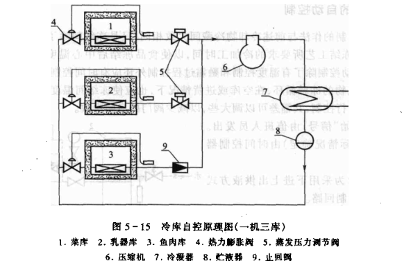 515所示為一機(jī)三庫自控原理圖,1號和2號庫房的蒸發(fā)溫度較高,故在蒸發(fā)器的出口裝有壓力調(diào)節(jié)闊.從而保證庫房蒸發(fā)壓力的恒定。