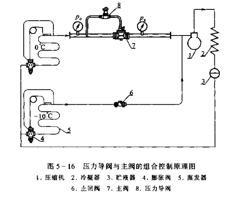 利用導(dǎo)閥和主閥的組合控制蒸發(fā)壓力和庫溢.可以滿足多種制冷裝置的需要,獲得多方面的控制效果,提高控制精度。圖516所示為壓力導(dǎo)閥與主閥的組合控制原理圖。