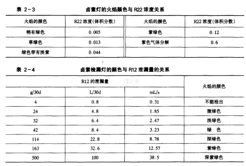 隨氟利昂制冷劑的泄漏量不同,鹵素燈有綠色、亮綠色、紫色等不同顏色的火焰,火焰顏色與R22濃度關系見表2一3,鹵素檢漏燈的顏色與R12泄漏量的關系見表2一4。