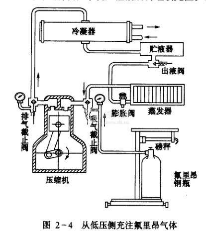 向氟利昂系統內充注氟利昂制冷劑時,一般在制冷機的低壓吸氣側注入氣體(見圖2一4),利用制冷機的真空逐漸吸入氣體。系統充注氟利昂制冷劑時,氟利昂鋼瓶應在充灌前、后稱重并記錄,以便計算氟利昂制冷劑充入量。