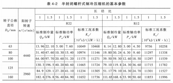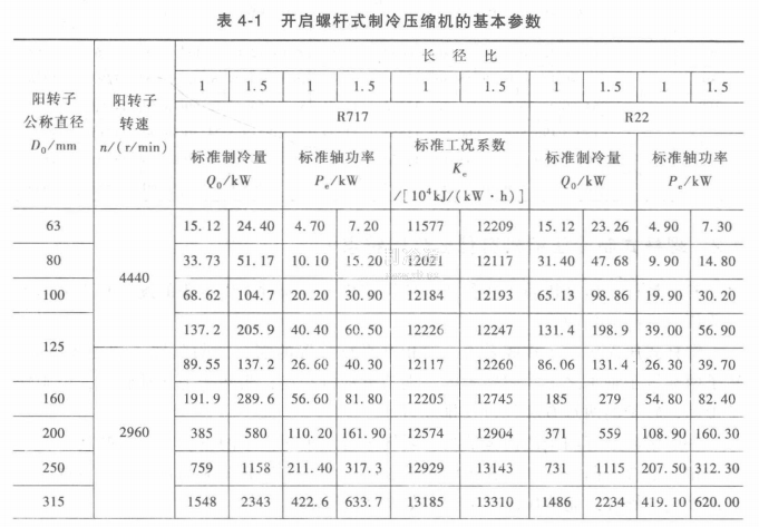 開啟螺桿式制冷壓縮機的基本參數見表4-1,半封閉螺桿式制冷壓縮機的基本參數見表4-2。