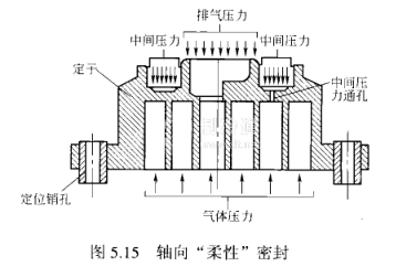 ②軸向“柔性”密封如圖5.15所示,壓縮機定子在軸向留有1mm的活動間隙,在正常運行條件下,渦旋定子受氣體的壓力(排氣壓力及與壓縮腔相通的中間壓力)作用,定子緊密與轉子結合形成斷面密封,當定子上端面氣體壓力減少或消失時,會產生渦旋定子頂端與轉子微量的分離現象,實現“卸載”。當有液體、雜質時,會產生壓縮腔內壓力升高現象,將定子頂起,壁面:濕壓縮“的故障,軸向“柔性”密封又有利于“卸載起動”利用軸向“柔性”密封,產生了“數碼渦旋壓縮機”。