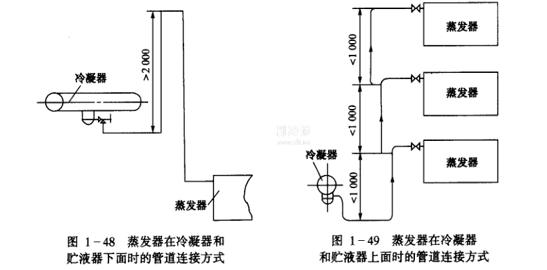 a.蒸發器位于冷凝器和貯液器下方時,在連接管道中要設計成圖1一48所示的倒U形。高度不小于2m。這種連接方式可防止制冷系統停止運行時,液體制冷劑流向蒸發器,但如液體管道上裝有電磁閥時,可不設里倒U形液封。