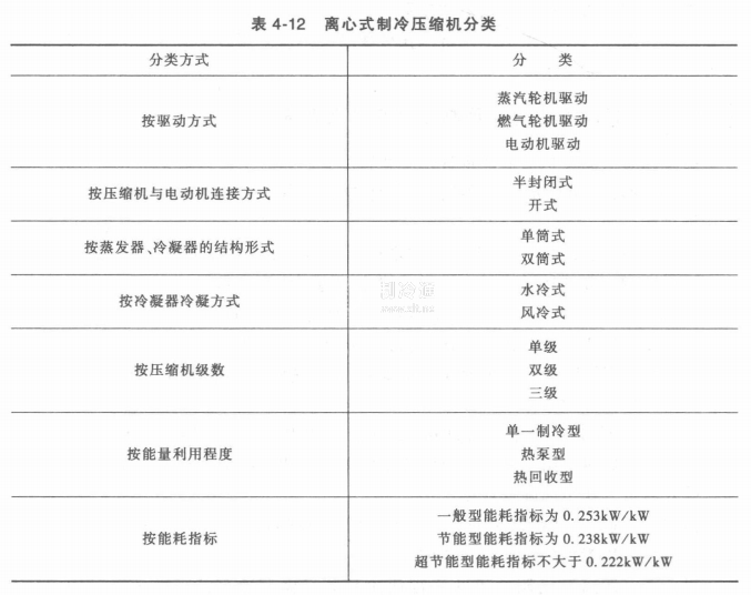 用于空調(diào)工程的機(jī)組通常稱為離心式冷水機(jī)組,分單筒式和雙筒式兩種,但單筒式居多;用于物料冷卻的稱為低溫制冷機(jī)組,一般是雙筒式的。所謂單筒,即蒸發(fā)器和冷凝器裝在同一簡(jiǎn)體內(nèi)。所謂雙簡(jiǎn),即燕發(fā)器、冷凝器分別裝在兩個(gè)筒體內(nèi)。另一種組裝形式是將離心式制冷壓縮機(jī)、蒸發(fā)器、冷凝器等設(shè)備分別安裝在建筑物內(nèi)和框架上,大型離心式制冷系統(tǒng),一般都屬于這種組裝形式。離心式制冷壓縮機(jī)具體分類見表4-12。