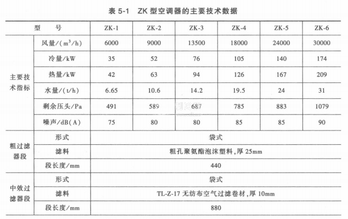 ZK型空調器的主要技術數據見表5-1。