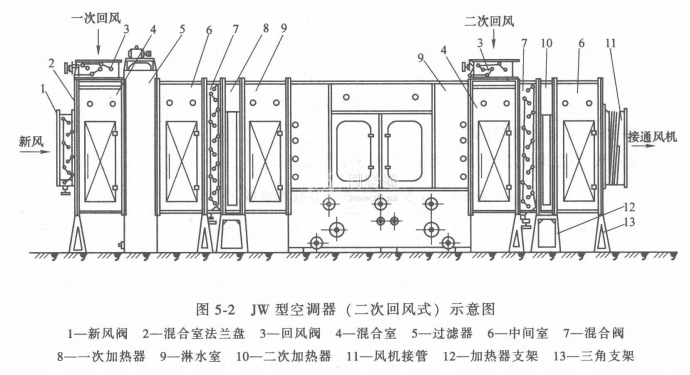 JW型空調器為大型臥式空調器,如圖5-2所示。機組風量由10000~160000m3/h,用于凈化空氣,調節溫度與濕度,與自動調節裝置配合后可保證室內空氣參數嚴格地控制在一定范圍內。它被廣泛地應用于紡織、印染、輕工、化工、電子儀表、精密機械制造等工業部門以及展覽館、影劇院等。