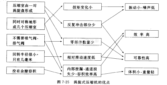 渦旋式壓縮機不需進、排氣閥 ,且制冷劑在渦旋體中流速較低,因此給變頻運行創造了極佳條件,它可以在13000~900r/min的范圍中較好運轉。另外,渦旋式壓縮機可以采用軸向和徑向的柔性密封,不僅提高了密封性能 ,大大提高了容積效率,而且對濕行程也不敏感,這對熱對在高壓比下運行時用噴液冷卻壓縮機提供了方便,并且在結構上的特殊性可采用帶經濟器運行 ,使效率得到進一步提高。它的優點可用圖7-25來表示。當然,渦旋式壓縮機和需有很高的加工精度和安裝技術,否則其優點無法實現。目前,渦旋式壓縮機的功率大致在0.75~11kW 范圍內。