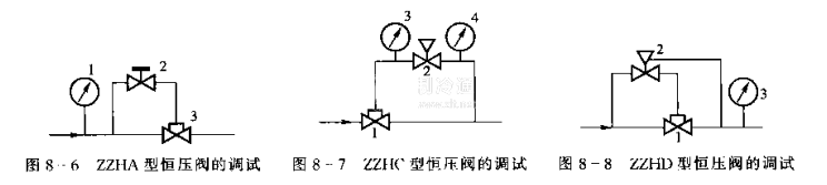 (2)ZZHA型調(diào)試時,需在其進(jìn)口端裝壓力表(表的精度不低于1.5級).如圖8一6所示。而ZZHB型調(diào)試時.將壓力表改裝在閥后即可。當(dāng)主閥進(jìn)口或出口壓力逐漸升高,達(dá)到某一數(shù)值時.ZZHA或ZZHB開啟,壓力表指針突然抖動。此時的壓力即為調(diào)定壓力。