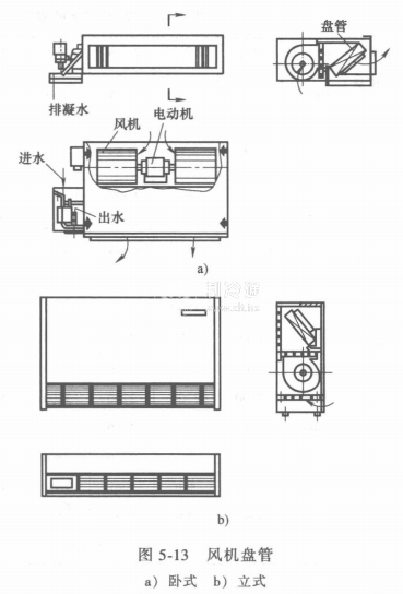 風機盤管加新風系統是中央空調的主要方式之一,因此風機盤管是空調設備的主要組成部分。風機盤管是一種將風機和表面式換熱盤管組裝在一起的裝置。風機盤管的形式有臥式、立式和頂置式等數種。風機盤管通常與冷水機組(夏)或熱水機組(冬)組成一個供冷或供熱系統。風機盤管是分散安裝在每一個需要空調的房間內(如賓館的客房、醫院的病房、寫字樓的各寫字間等)。為了縮小外形和體積以及降低氣流噪聲,多采用貫流式風機并用多級電動機驅動,以便對風量進行調節。圖5-13所示為臥式暗裝風機盤管和立式明裝風機盤管的結構圖。