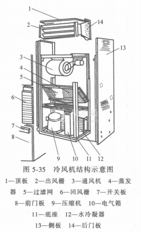 冷風(fēng)機(jī)組由制冷系統(tǒng)部件(壓縮機(jī)、冷凝器、蒸發(fā)器、節(jié)流裝置及壓力繼電器等)、空氣過濾器、通風(fēng)機(jī)及溫度控制裝置組成。而冷熱風(fēng)機(jī)組分電熱型、熱泵型。除上述部件外還分別裝有電加熱器、制冷劑換向閥。水冷式冷(熱)風(fēng)機(jī)組是將上述部件均組裝在同一箱體內(nèi)。其結(jié)構(gòu)示意圖如圖5-35所示。