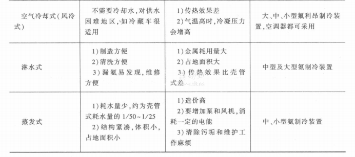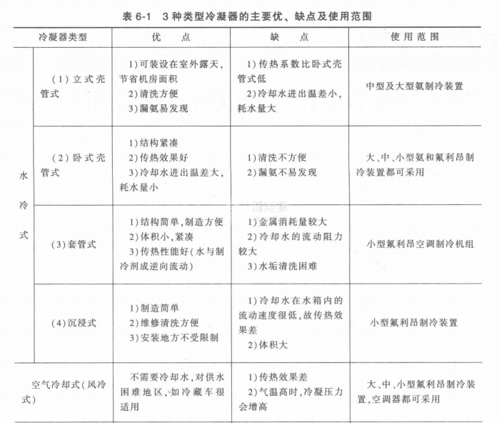 以上3種類型冷凝器的優(yōu)、缺點及使用范圍見表6-1。