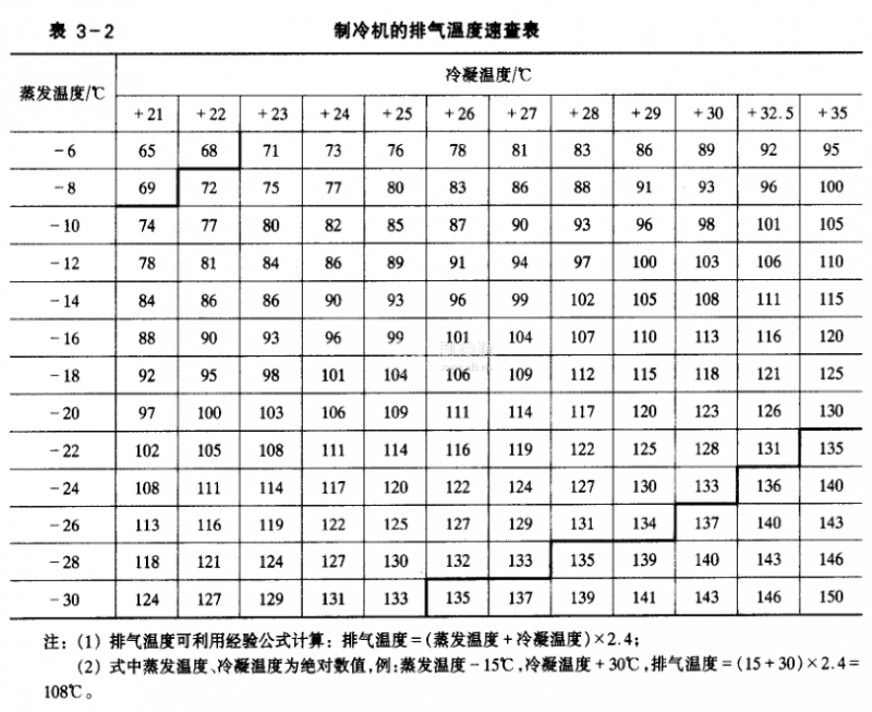 (3)制冷機(jī)的排氣溫度應(yīng)與蒸發(fā)溫度和冷凝溫度相適應(yīng)(表3一2),