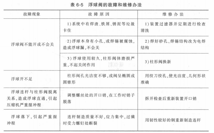 浮球調(diào)節(jié)閥失靈的主要原因是容器內(nèi)的液面經(jīng)常波動,引起浮球閥啟閉頻繁,閥芯與閥座很容易磨損。浮球閥的故障和維修辦法見表6-5。