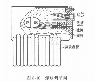 低壓浮球閥是以低壓液面的高低來控制進(jìn)液量的調(diào)節(jié)閥,也是自動調(diào)節(jié)蒸發(fā)器流量的節(jié)流器,圖6-10所示為小型制冷設(shè)備用的低壓浮球閥。它與下面的蒸發(fā)盤管結(jié)合一體,成為節(jié)流閥與蒸發(fā)器的組合體,浮球與閥針由杠桿、鉸鏈連接組成進(jìn)液控制閥。當(dāng)液面下降時(shí),浮球與液面一起下落,閥針被打開或開大,進(jìn)液量增大。當(dāng)液面上升,浮球隨液面上升,而關(guān)小閥門,進(jìn)液量減少;當(dāng)液面上升到控制高度時(shí),閥針就關(guān)閉閥門,停止進(jìn)液。所以浮球閥是將液面的變化作為調(diào)節(jié)流量的動力。