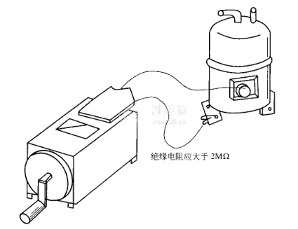 在測量全封閉壓縮機電機繞組的直流電阻值的同時,還必須測量壓縮機電機繞組的絕緣電阻。其方法是將兆歐表的兩根測量線連接在壓縮機的引線柱和外殼之間,用500V兆歐表進行測量時,其絕緣電阻值不應低于2MΩ。若測得的絕緣電阻低于2MΩ,則表示壓縮機電機繞阻與鐵心之間發生漏電,不應繼續使用。壓縮機絕緣電阻的測量方法如圖7.22所示。
