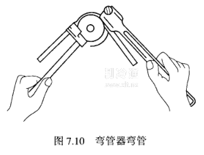 彎管器有各種不同的形式,圖7.10所示的只是其中一種。用粗細不同的鋼絲,繞制許多不同內徑和不同長度的彈簧,就成為一組彈簧彎管器。變管徑較大的彈簧計管器鋼絲較粗、內徑也較大,而繞成的彈簧也較長。