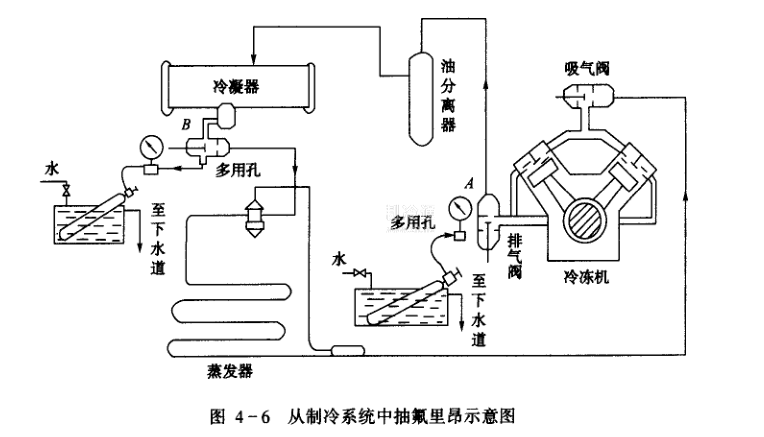 氟利昂制冷系統中的高壓設備維修或系統大修時,可把氟利昂制冷劑抽到鋼瓶內貯存具體做法如圖4一6所示。