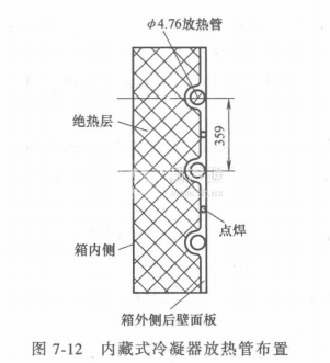 內藏式冷凝器結構如圖7-12所示。它是將冷凝器盤管點焊在箱體后壁薄鋼板里層,使放熱管固定,放熱管的另一側緊靠絕熱層泡沫塑料之后,這樣后壁面板即成了散熱板。