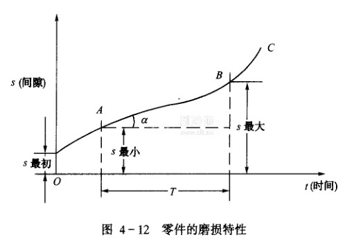 圖中的八月段曲線表示工作磨損階段,這時的磨損應為正常工作磨損。這一階段中的磨損過程十分平穩,時間T表示零件的使用期限。零件使用期限的后期,磨損過程將逐漸加快,當磨損量增至B點的磨損值時,零件的磨損就超出了正常工作磨損階段。