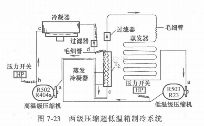 為了獲取-40℃以下的低溫,使用常規(guī)的單級壓縮制冷循環(huán)是難以實現(xiàn)的,所以人們又經(jīng)過不斷的實踐和總結(jié)而研究出兩級壓縮制冷循環(huán)系統(tǒng)和復(fù)疊式制冷系統(tǒng)。