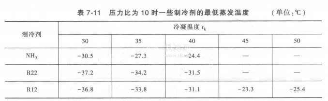 一般規(guī)定,采用氟利昂制冷劑的單級壓縮機的最大壓力比不應(yīng)超過10。當壓力比等于10時,在不同冷凝溫度時一些常用的中溫制冷劑所能達到的最低蒸發(fā)溫度見表7-11。