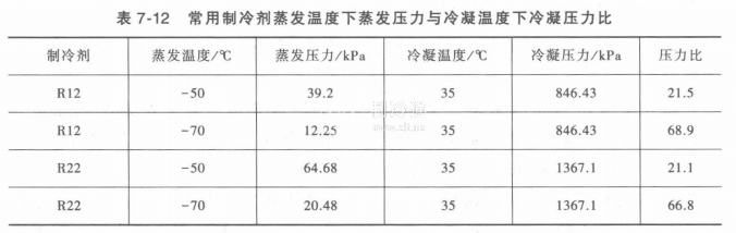 因此,單級壓縮制冷要獲得-35℃以下的低溫是很難實現(xiàn)的,而必須采用兩級壓縮方式予以解決,以降低壓力比,見表7-12。