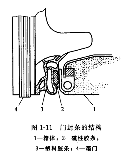 1-11所示是門封條的結構。從圖中可以看出,門封條中穿插的磁性膠條應具有較強的磁性吸力。一般磁性膠條是用擠壓機擠出成型再進行充磁而成。充磁后的磁場強度為8000~10000Oe(1Oe=79.5775A/m),剩余磁感則在500G(1G=10 ̄?T)以上。用彈簧秤鉤住箱門把手,垂直于箱門方向打開箱門時,其開啟拉力應在1.5kgf1kgf=9.80665N)左右。因此,磁性膠條是保證門封密封性的關鍵部件。在使用中,磁性膠條的老化、硬化和脆化常造成斷裂、氣泡、掉塊和脫粉現象,造成貼合不緊、密封不嚴,只有重新更換。但單純更換磁性膠條必然會破壞塑料膠條的密封性,所以更換的方法一般是連同整個門封條一起更換。