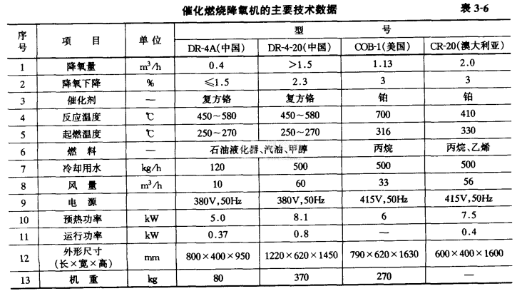 催化燃燒降氧機 催化燃燒降氧機是利用催化燃燒反應,降低庫內空氣中的含氧盤,達到降氧的目的。主要用于水果和蔬菜的低氧貯藏,即氣調貯藏。可以達到長期保鮮的效果。已知國內外催化燃燒降氧機的型號及主要技術數據見表3-6。