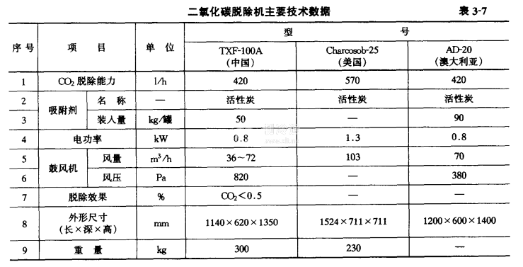 二氧化碳脫除機 二氧化碳脫除機是用來控制氣調庫中二氧化碳((o})的濃度,主要用于水果和蔬菜的氣調貯藏。可以達到長期保鮮的效果。已知國內外二氧化碳脫除機的型號及主要技術數據見表3-7。