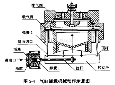 活塞式壓縮機氣缸卸載裝置機械動作原理如圖5-4所示。該機構的動作是靠壓縮機的潤滑油泵的油壓和彈簧1進行的。在制冷壓縮機啟動前,因無油壓進油缸,油缸內的油活塞在彈簧1的推動下,處在油缸的左端,套在氣缸外的轉動環在拉桿的帶動下向左轉動,使頂桿克服彈簧2的彈力而將氣缸吸氣閥片頂開,從而使該氣缸處于卸載工況。壓縮機啟動后,當控制油路的電磁閥斷電關閉時(二通閥為通電開啟),油泵輸出的壓力油進入油缸,將油活塞推向油缸的右端,套在氣缸外的轉動環在拉桿的帶動下向右轉動,使頂桿落入斜面切口中,吸氣閥片落下回到閥座,從而使該氣缸上載。只要對油路進行控制,壓縮機就可上載或卸載。