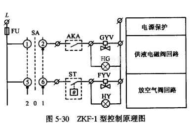 如圖5-30所示,當選擇開關SA撥到“0”位時,控制電源切斷,ZKF-1型可手動操作方式工作,ZKF-2型因有熱力膨脹閥阻隔,不能手動操作。