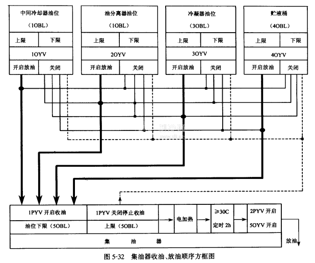 在上述放油過程中,若集油器內的油位上升至上限位時,則正在放油的電磁閥自動關閉停止放油。當集油器的油位降到下限時,關閉放油電磁閥5OYV后。上次未放完油的容器會再次打開放油電磁閥繼續放油。當所有的容器按程序放油完畢。又開始一個新的循環,重復上述程序進行放油。