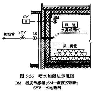 冷卻間和冷卻物冷藏間一般安裝了空氣冷卻器,可以在冷風機出風口安裝噴嘴或具有小孔的水管,按控制濕度給定值自動啟閉水電磁閥,向室內空氣中噴水霧或蒸汽,使空氣中的含濕量增加。也可利用現有的沖霜水裝置進行噴淋加濕。加濕方法如圖5-56所示,某蔬菜庫的冷卻物冷藏間的墻上安裝帶有噴嘴的水管(或采用有小孔的水管)。噴霧方向呈水平或略向上,注意不要噴到頂棚、梁、柱和食品上,否則就要發生結露。