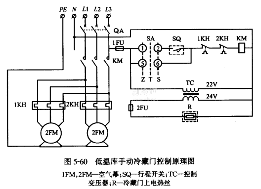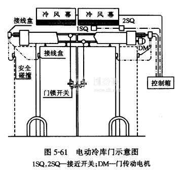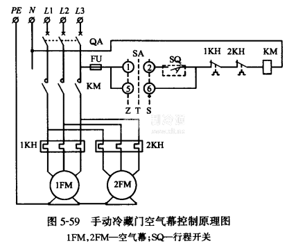 冷卻物冷藏間手動冷庫門的自動控制回路 在冷庫門框上方安裝行程開關,當冷庫門打開時,行程開關接通空氣幕電路,風幕啟動。當冷庫門關閉,行程開關切斷空氣幕電路,冷風幕停止運轉。空氣幕控制原理圖見圖5-59。