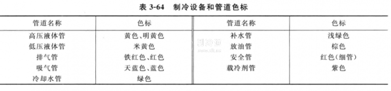 2管道防腐工程應(yīng)在系統(tǒng)嚴(yán)密性試驗(yàn)合格后進(jìn)行。保溫管道及安裝管道、鍍鋅管可不做防腐。對(duì)于非保溫明裝管.鍍鋅外刷調(diào)合漆兩道.無縫鋼管外表面在認(rèn)真除銹后.外表刷紅丹防銹漆兩道,調(diào)合漆兩道.再根據(jù)管道類型在表面涂以色標(biāo)漆與流向,制冷設(shè)備和管道的色標(biāo)見表3-64。非鍍鋅金屬構(gòu)件去銹后刷紅丹漆兩道,外刷調(diào)合漆兩道。