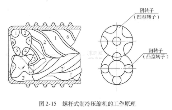 螺桿式制冷壓縮機的工作原理如圖2-15所示。在電動機的帶動下,主動轉子與電動機一起旋轉,此時嚙合的從動轉子也跟隨相向運轉。在轉子運動中,當主動轉子和從動轉子的一對嚙合的溝槽與吸氣管道連通時,即進行充分吸氣;當轉子繼續旋轉,這對吸氣的溝槽在吸氣端面上離開了吸氣孔口,吸、排氣端座所封閉的齒槽內的氣體被機殼外界隔絕,并開始被壓縮;主動、從動轉子繼續旋轉,主動轉子的齒峰連續地向從動轉子的齒谷(即溝槽)中填塞,同樣,從動轉子的齒峰也不斷地填塞對應的主動轉子的齒谷,這樣互相填塞的結果,使各自轉子的溝模容積逐漸減少,溝槽中的氣體被逐漸壓縮。當氣體壓力達到指定值后,轉子轉到溝槽與排氣口相連通的位置,把氣體排出。如此連續不斷地運轉,制冷劑不斷被壓縮后從螺桿壓縮機排出。