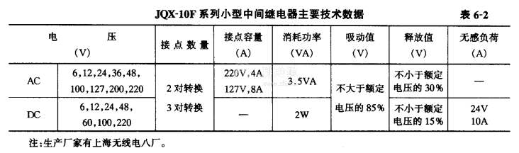 動作電壓不大于額電壓的85%;釋放電壓,交流不小于額定電壓的30%,直流不小于額定電壓的15%;連續(xù)工作最高電壓不超過110%,繼電器具有透明防塵罩和插座,便于安裝和更換。主要技術數(shù)據(jù)見表6-2。