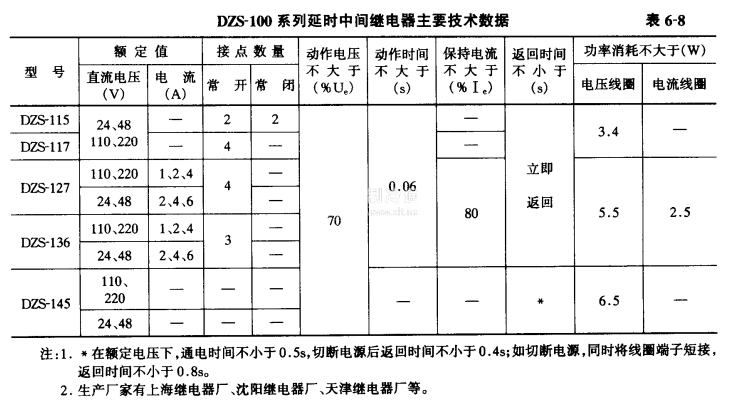 c.DZS-100系列電磁式時間繼電器:是吸片式電磁延時中間繼電器,作為輔助繼電器,用于直流操作的保護回路中,以增加主保護繼電器的接點數量或接點容量。DZS-115,DZS-117型繼電器為動作延時繼電器,有1個工作線圈(電壓線圈)。DZS-145型繼電器為延時返回繼電器,有1個工作線圈(電壓線圈)和1個阻尼線圈。DZS-127,DZS-136型繼電器為延時電壓動作和電流保持的繼電器。有1個工作線圈(電壓線圈)和兩個保持線圈(電流線圈)。主要技術數據見表6-8。
