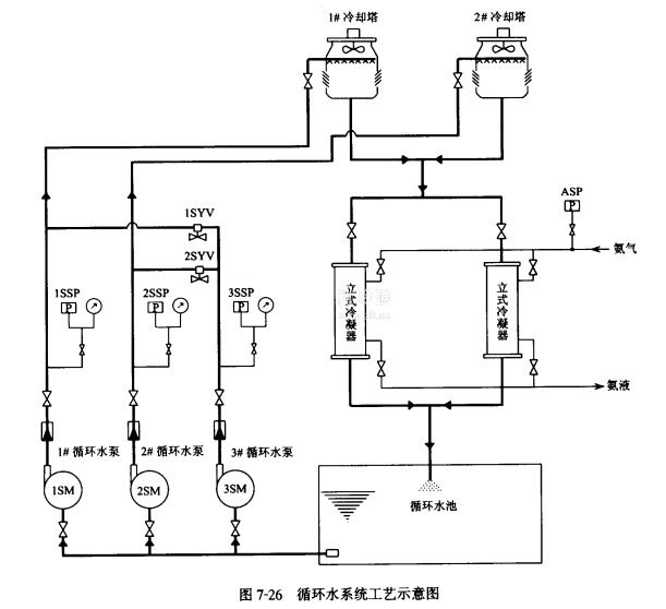 例如某冷庫循環(huán)水泵房內(nèi)有3臺循環(huán)水泵,機房屋頂安裝兩臺冷卻塔。工藝示意圖如圖7-26所示。冷凝器進氣管上安裝有ASP壓力控制器,控制冷凝壓力。循環(huán)水泵出水管上分別安裝有1SSP,2SSP,3SSP壓力控制器,作為循環(huán)水泵安全保護。給水管上安裝有1SYV和2SYV電磁閥作為備用泵投入時管路切換。