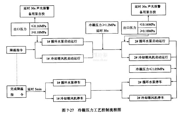 1 SSP-3SSP壓力控制器分別保護1#-3#循環(huán)水泵,當水泵啟動后出水管無水,出口壓力小于0.16MPa時,則相應(yīng)的SSP壓力控制器下限位觸頭吸合,延時30s后聲光報普,水泵自動停車,備用循環(huán)水泵自動投入運行。如出口壓力)0.18MPa時,則相應(yīng)的SSP壓力控制器上限位觸頭吸合,循環(huán)水泵正常運行。工藝流程如圖7-27所示。
